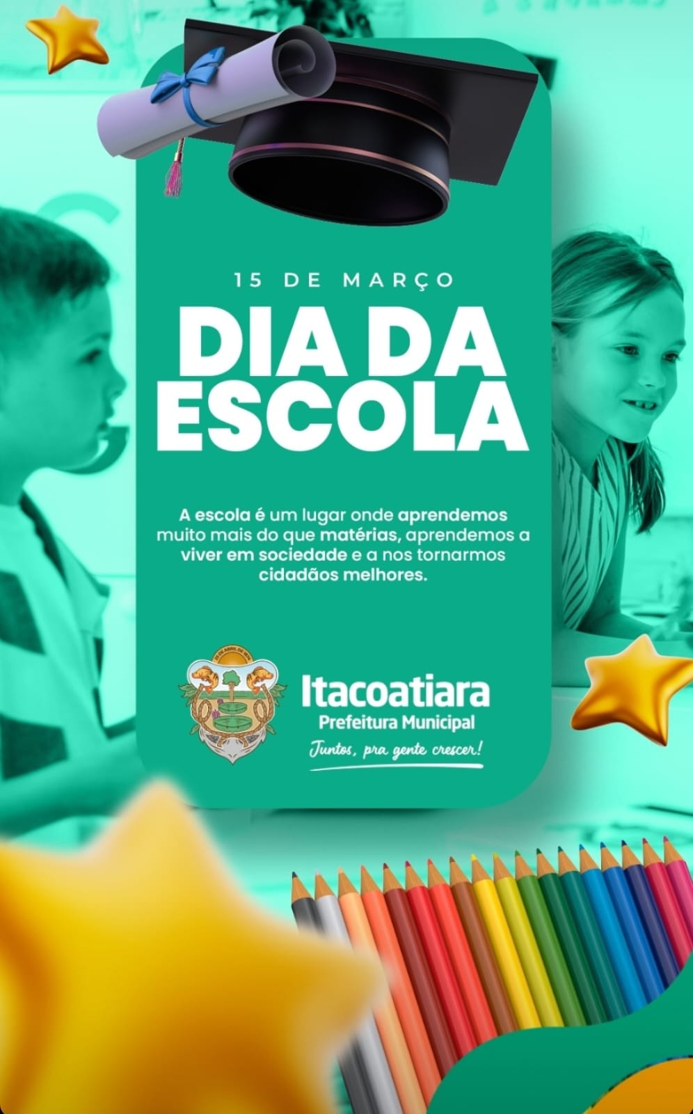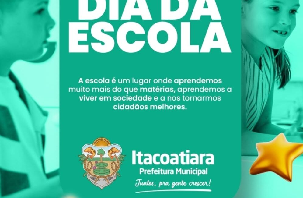 A Prefeitura, por meio da Secretaria Municipal de Educação – SEMED, tem a alegria em parabenizar todos os estudantes municipais e todo o corpo docente, e aos servidores da educação que compõem as nossas escolas de Itacoatiara, que representam o berço no qual nasce o indivíduo social.