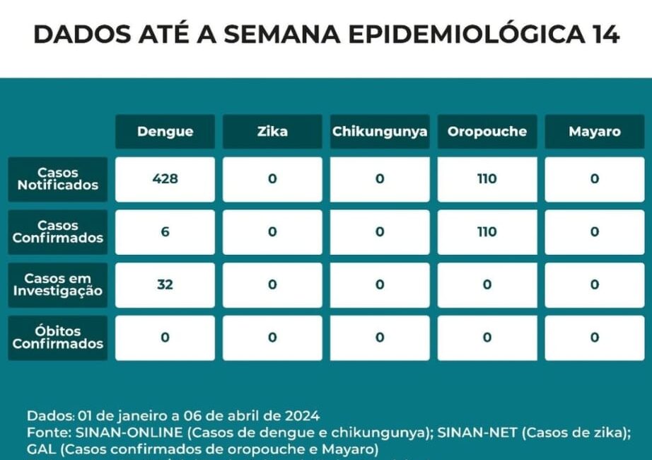 Fonte: SINAN-ONLINE (Casos de dengue e chikungunya); SINAN-NET (Casos de zika); GAL (Casos confirmados de oropouche e Mayaro).
