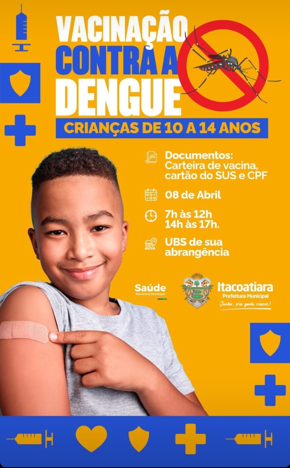 Nesta segunda-feira (08), a Prefeitura, por meio da Secretaria Municipal de Saúde – SEMSA, dá início a vacinação contra a Dengue em crianças e adolescentes na faixa etária de 10 a 14 anos.