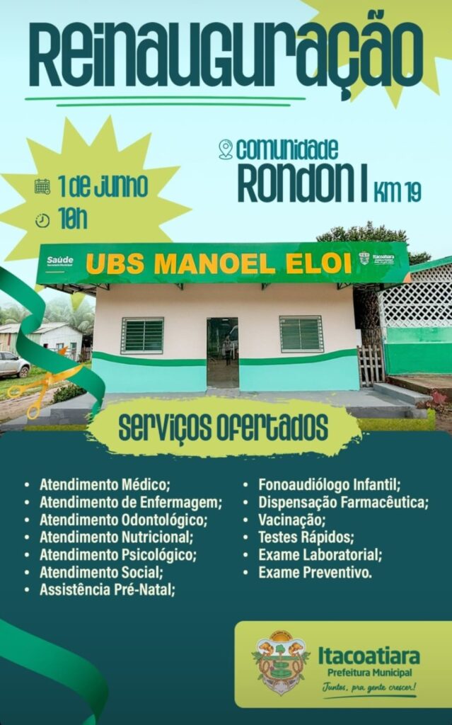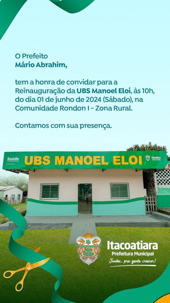 Tem a honra de convidar para a Reinauguração da UBS Manoel Eloi, às 10h, do dia 01 de junho de 2024 (Sábado), na Comunidade Rondon I – Zona Rural.