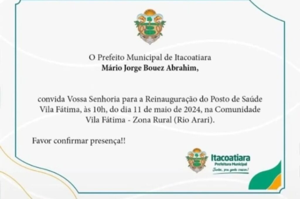 O Prefeito Municipal de Itacoatiara Mário Jorge Bouez Abrahim, convida Vossa Senhoria para a Reinauguração do Posto de Saúde Vila Fátima, às 10h, do dia 11 de maio de 2024, na Comunidade Vila Fátima – Zona Rural (Rio Arari).