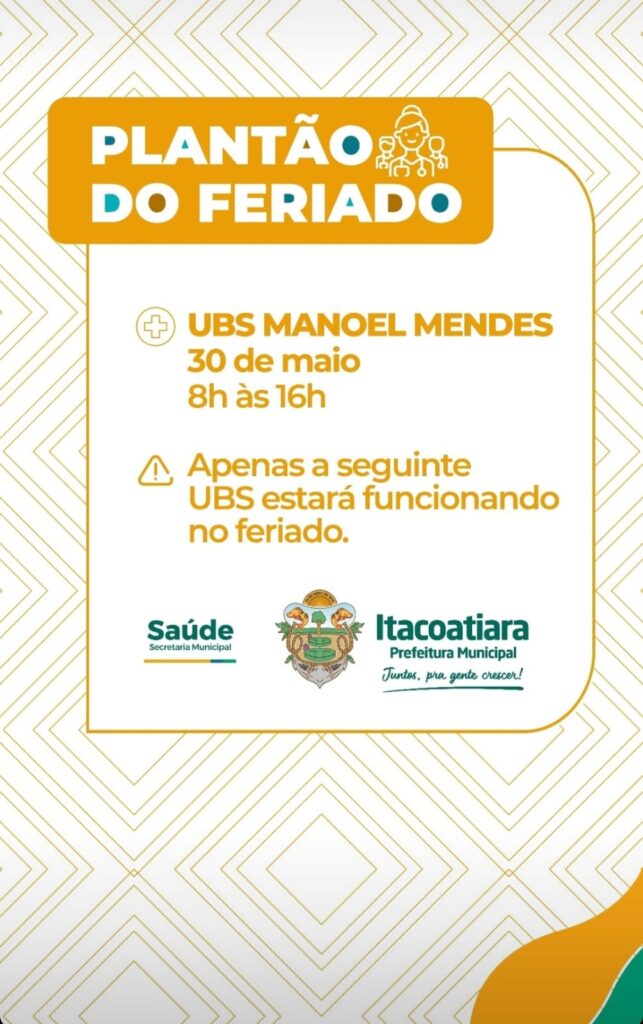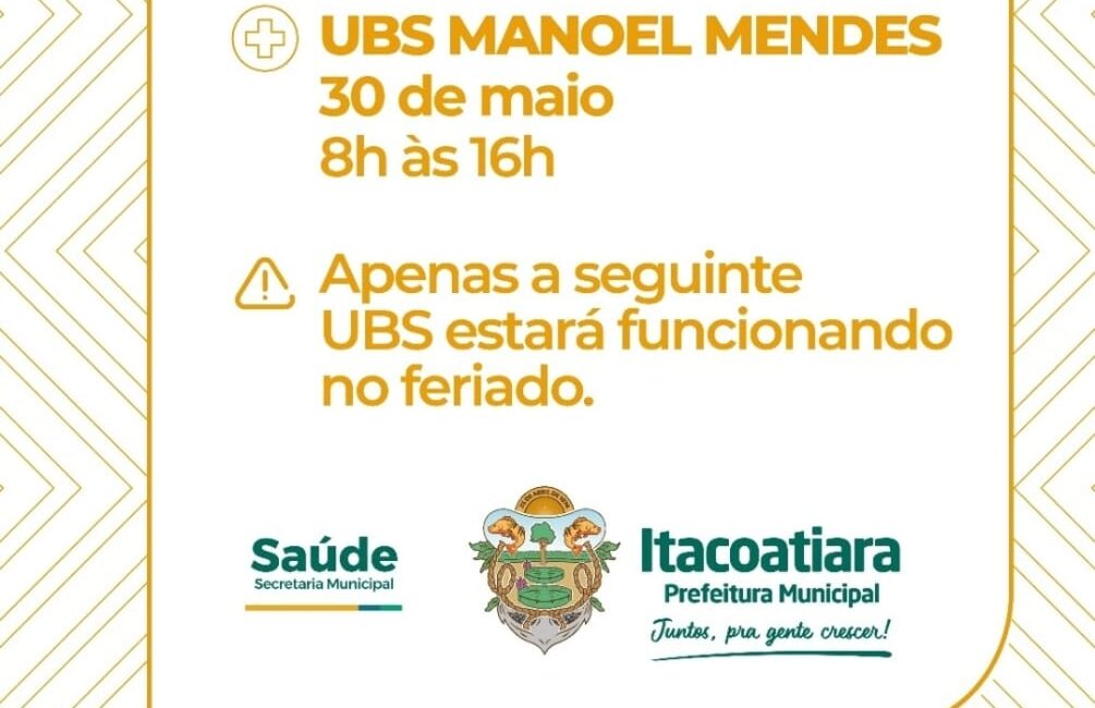 A Prefeitura de Itacoatiara informa que apenas a Unidade Básica de Saúde (UBS) Manoel Mendes estará de Plantão no dia 30 de maio, funcionando de 8h às 16h.