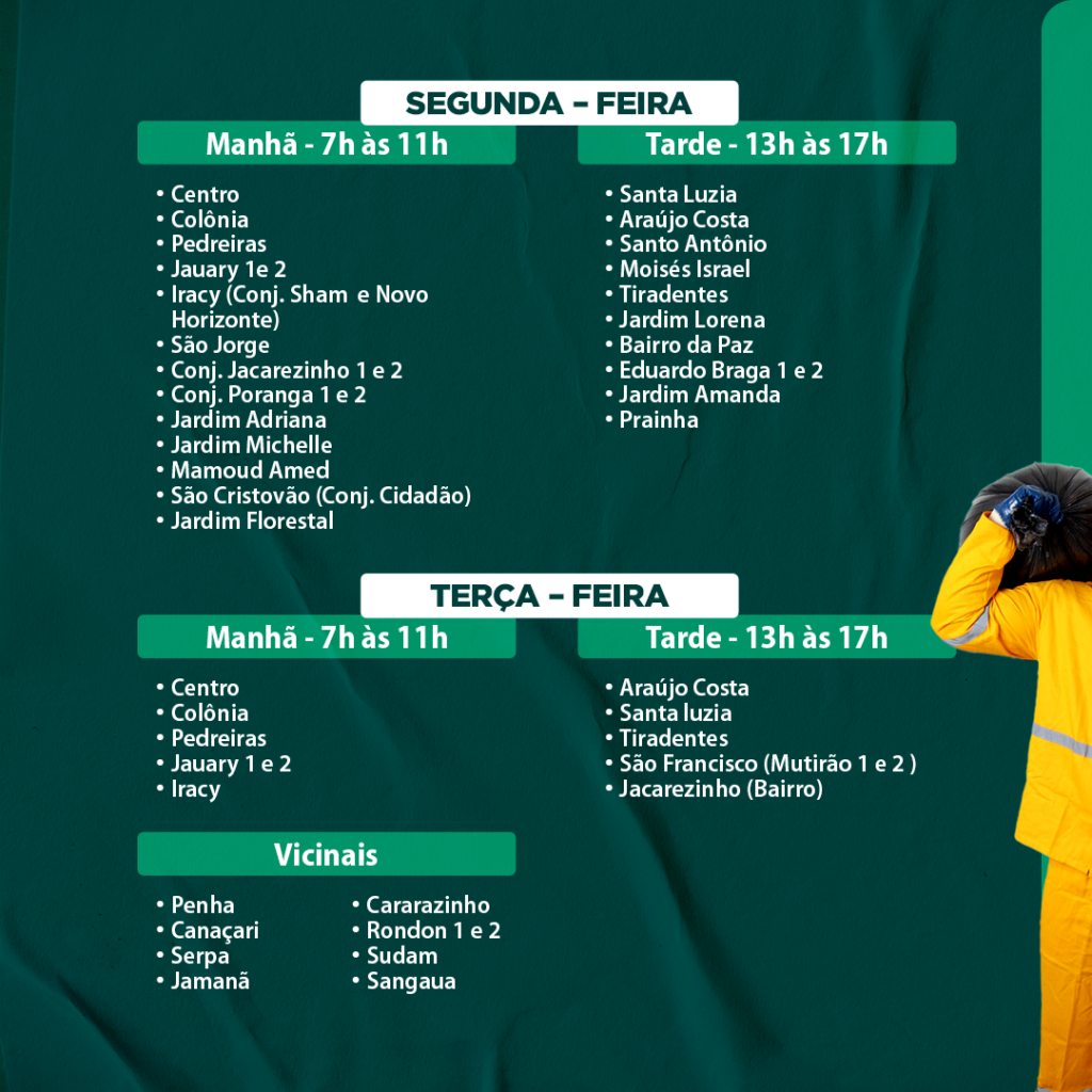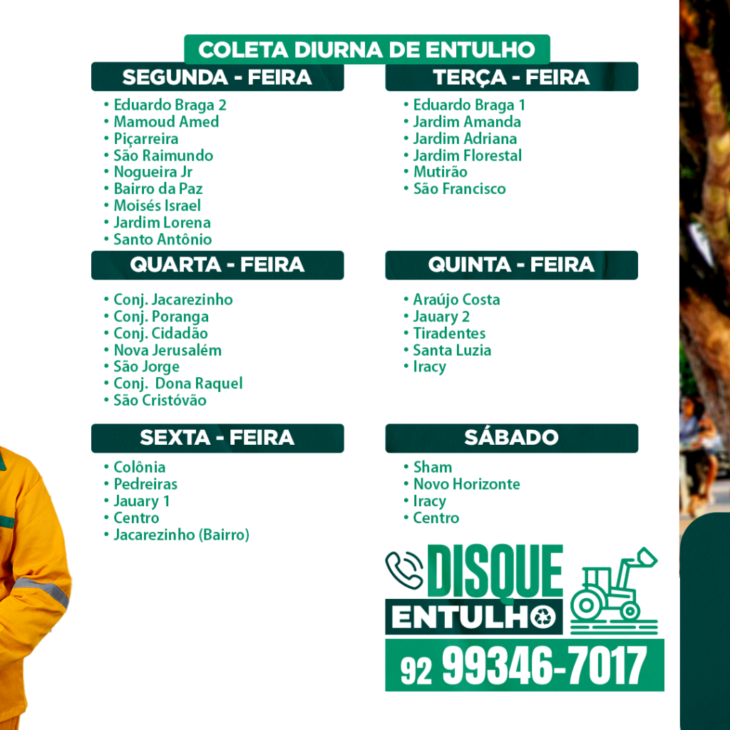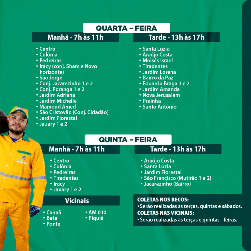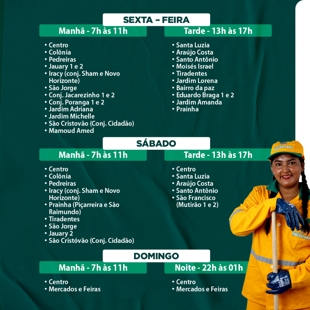 A SEINFRA tem intensificado serviços fundamentais para o município, como capina e varrição das vias. A colaboração da população é essencial para manter a cidade em perfeito estado de conservação. Para isso, é importante que os munícipes respeitem os dias e horários da coleta domiciliar e acondicionem corretamente os resíduos.