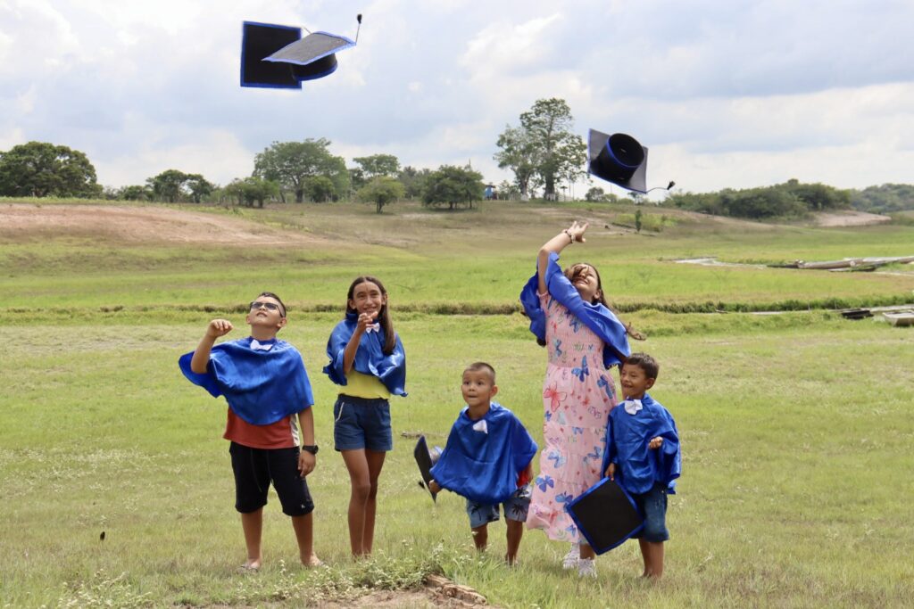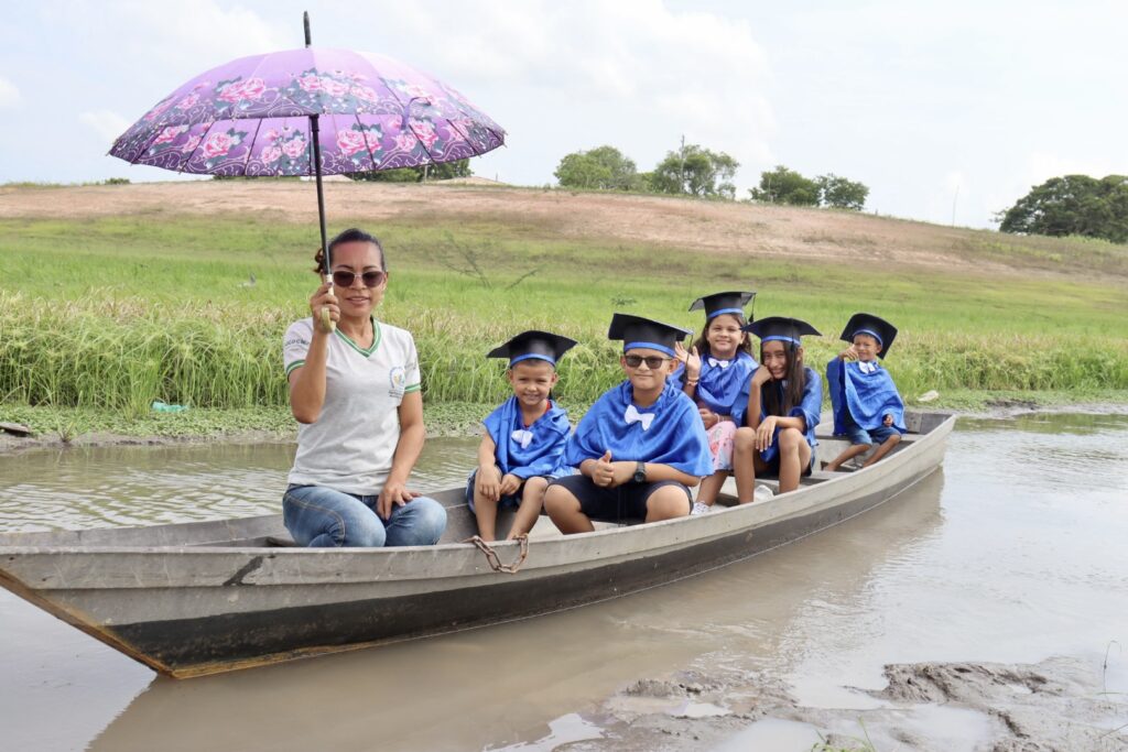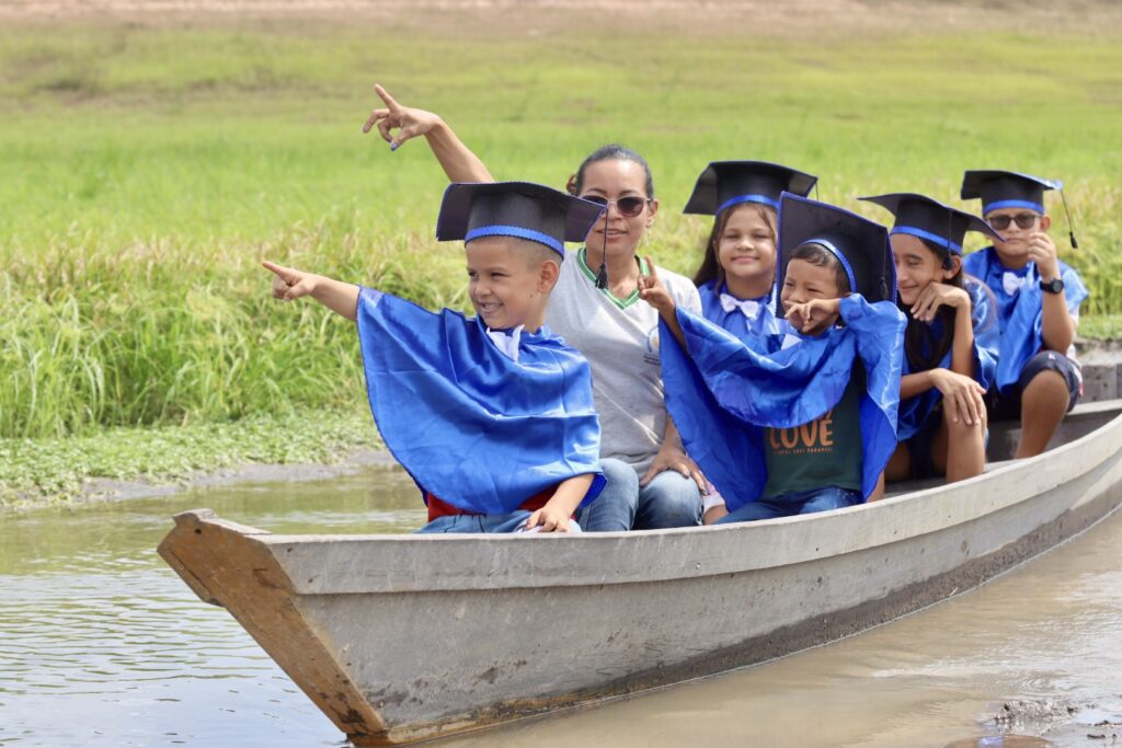 Vestidas com becas, elas posaram para as fotos, com a canoa como cenário – um meio de transporte essencial para chegar à escola, mas que, devido à estiagem, se tornou um desafio ainda maior. A jornada até a escola, antes feita por meio de rios caudalosos, agora exige um esforço extra das famílias e das crianças, que precisam percorrer longas distâncias por caminhos alternativos.