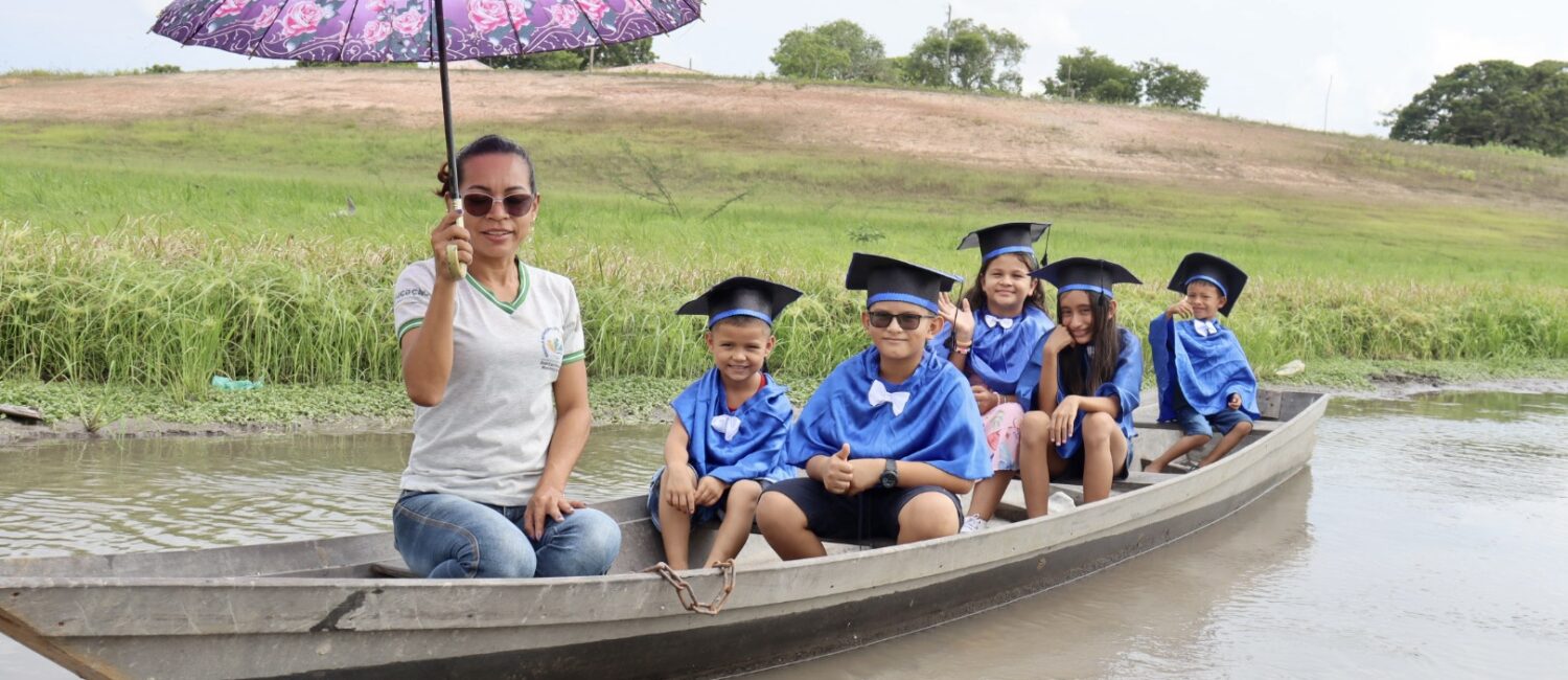 Vestidas com becas, elas posaram para as fotos, com a canoa como cenário – um meio de transporte essencial para chegar à escola, mas que, devido à estiagem, se tornou um desafio ainda maior. A jornada até a escola, antes feita por meio de rios caudalosos, agora exige um esforço extra das famílias e das crianças, que precisam percorrer longas distâncias por caminhos alternativos.