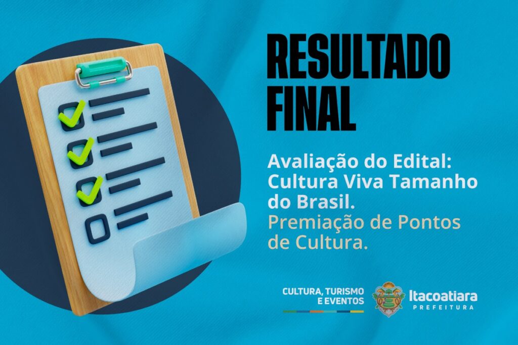 A Prefeitura Municipal de Itacoatiara, através da Secretaria Municipal de Cultura, Turismo e Eventos – SEMCTUR, torna público o RESULTADO FINAL de Avaliação do Edital de Chamamento Público n° 003/2025 PMI credenciamento (processo administrativo nº 2458/2025-PMI) Cultura Viva Tamanho do Brasil: PREMIAÇÃO DE PONTOS DE CULTURA.