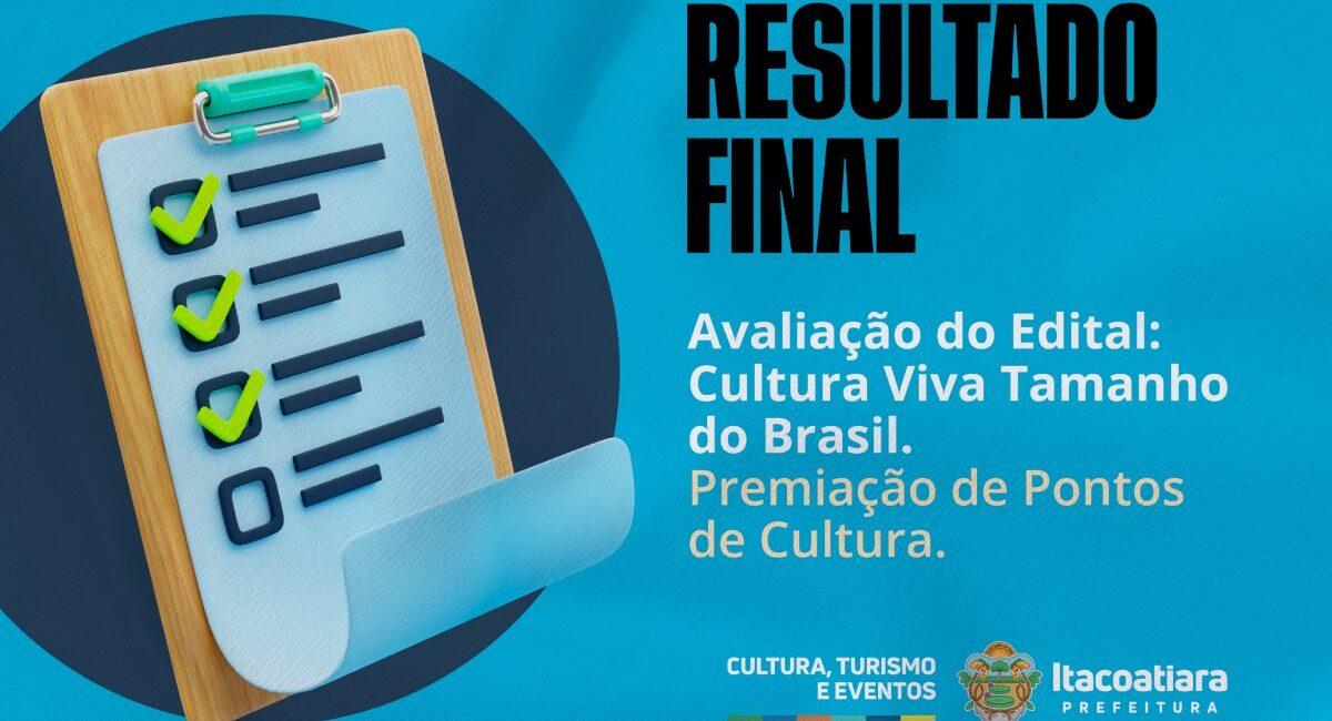 A Prefeitura Municipal de Itacoatiara, através da Secretaria Municipal de Cultura, Turismo e Eventos – SEMCTUR, torna público o RESULTADO FINAL de Avaliação do Edital de Chamamento Público n° 003/2025 PMI credenciamento (processo administrativo nº 2458/2025-PMI) Cultura Viva Tamanho do Brasil: PREMIAÇÃO DE PONTOS DE CULTURA.