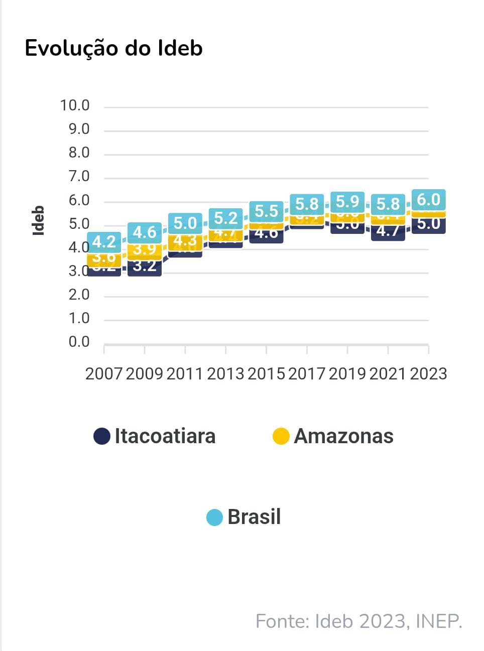Os gráficos do Ideb mostram que Itacoatiara avançou de forma contínua na aprendizagem, chegando à nota 5,0 em 2023, segundo o Inep. Esse crescimento ao longo dos anos reflete o trabalho da Prefeitura de Itacoatiara, que vem investindo em formação de professores, melhorias estruturais e ações pedagógicas que fortalecem o ensino.