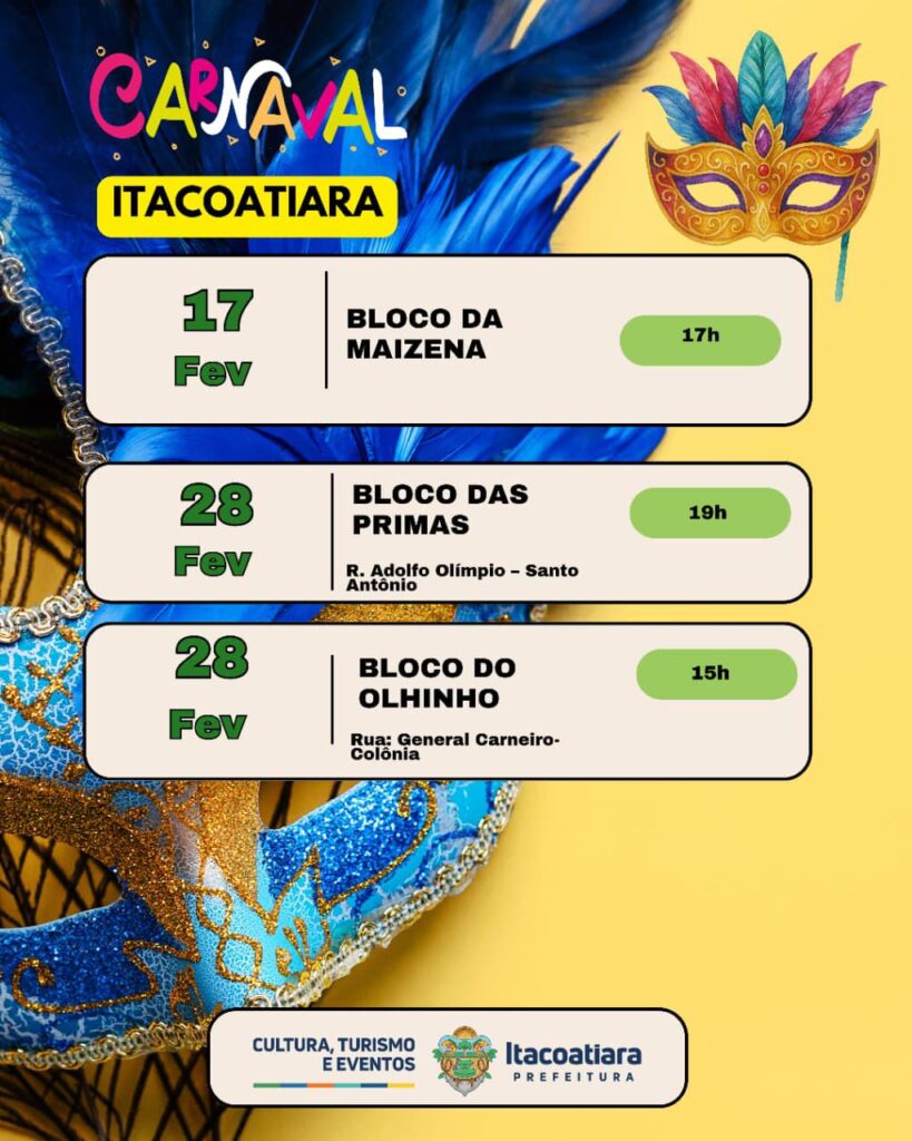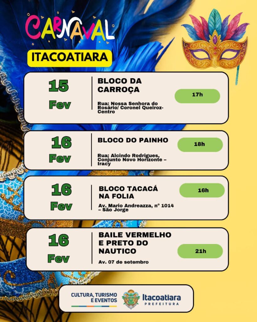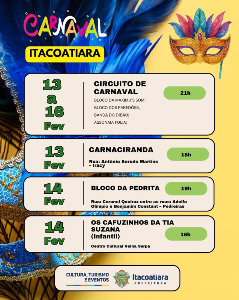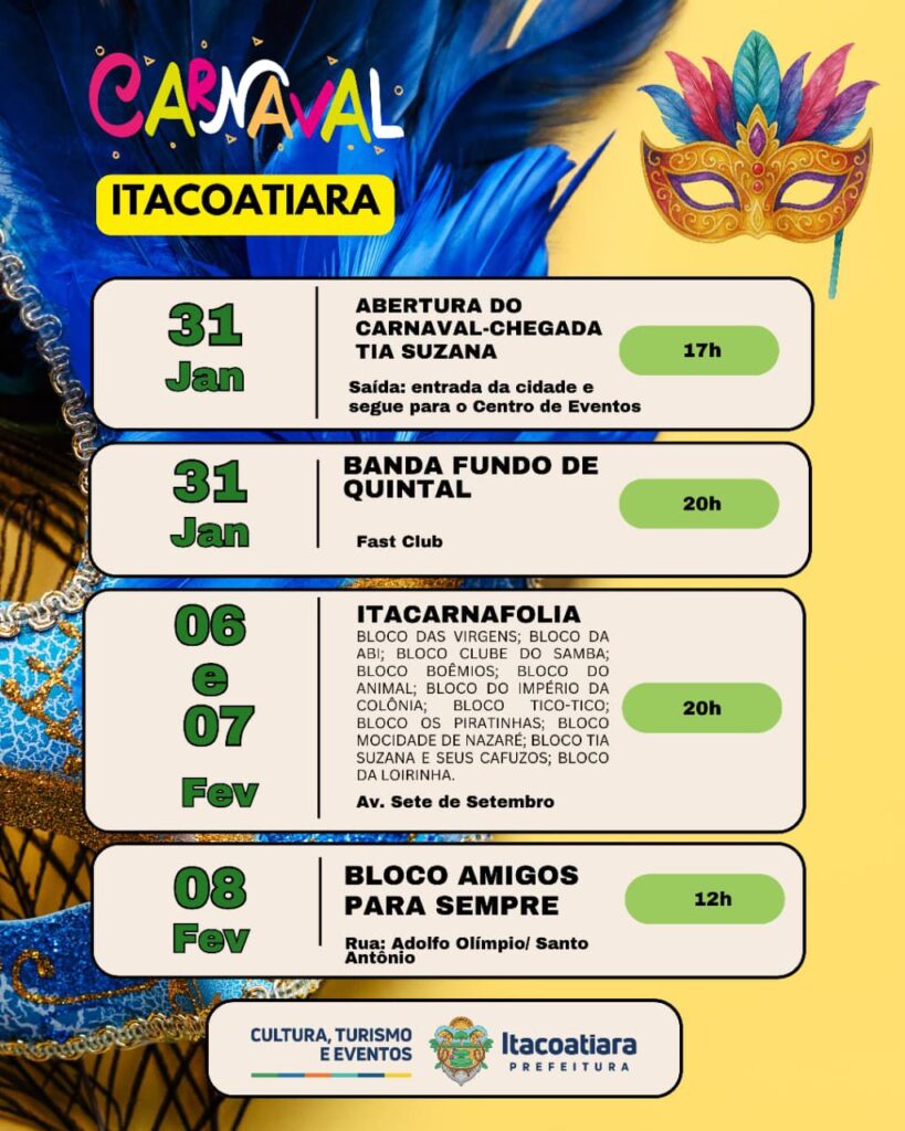 A Prefeitura Municipal de Itacoatiara, por meio da Secretaria Municipal de Cultura, Turismo e Eventos, divulgou oficialmente a Agenda Cultural das Bandas e Blocos de Carnaval 2026, reunindo as programações que irão movimentar a cidade durante o período carnavalesco.